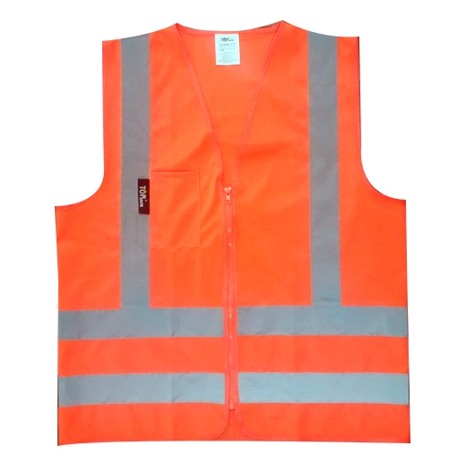 Chaleco reflectivo en malla color naranja neón con cremallera y bolsillo. 150 gramos